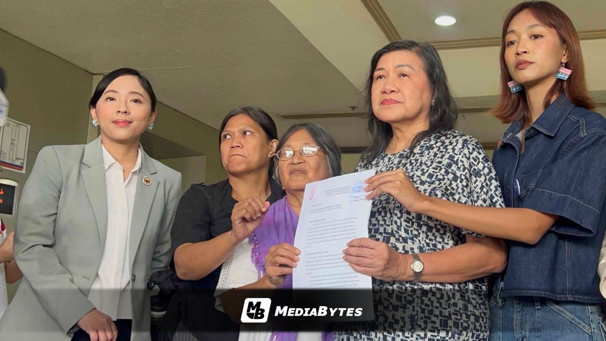 Maza, joined by Gabriela National Alliance chair Gert Libang, Gabriela Youth spokesperson Fran Reyes, and Kilusan ng Manggagawang Kababaihan spokesperson Jacq Ruiz, filed an ethics complaint with the House Committee on Ethics and Privileges.
