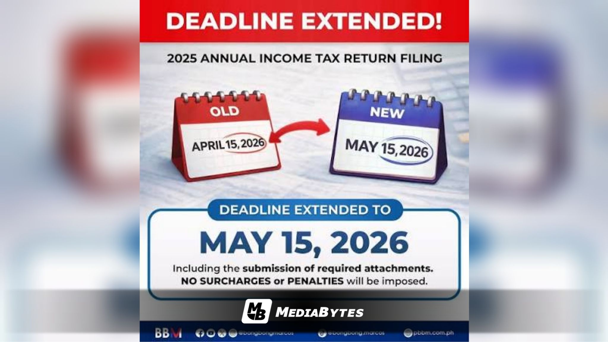 President Ferdinand Marcos Jr. on Tuesday announced a one-month extension for the filing of the 2025 Annual Income Tax Returns (ITR), moving the deadline to May 15, 2026.
